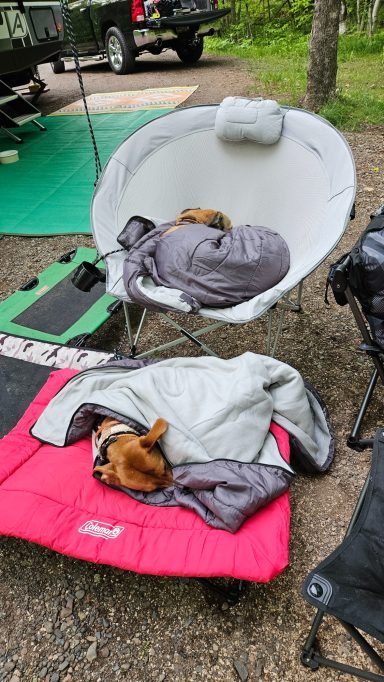 The photo of the small building is where you check in when you arrive. Two of our dogs are taking a nap and staying warm with their Dog Sleeping Bags. We cooked one of our dinners over the open fire using our new Swivel Campfire Grill. The campsite is fairly secluded which you can see in the photos. We went down to Duluth one day and while waiting for my Wife, the Minnesota Slip Bridge opened so I took a photo.